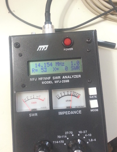 Showing the MFJ 259B antenna analyzer set at 14.154 mHz resonance. What I did is sweep the analyzer from 13.0 to about 15.0 to find the resonant spot (no reactance), and trimmed equal amounts of wire from each side until resonance came in at 14.150. I used copper split bolts to facilitate the connections. Although the calculated length is near 16.5 ft per side, I started out with 17.5 ft just in case. It is easier to cut than to add wire! Note that SWR and resonance are not exactly the same thing. Resonance is indicated by zero reactance on X=0 at the LCD readout. The resistance is 53 ohms, very close to the ideal 50 ohms. SWR=1.0 on the LCD and the analog left hand meter. If you do not have an MFJ-259B (or the 269B) meter, you can accomplish the same thing by setting your transmitter on 14.000 and shortening the wires equaly on both sides, until the SWR is at its lowest. It will be "close enough for government work." | ||||||||||||||||||||||||||||||||||||||||||||||||||||