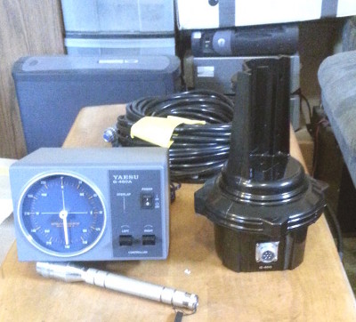 The rotor has arrived! The rotor has arrived, and I have it calibrated per Yaesu's Instructions. This is the Yaesu G450 unit, the lightest/smallest they have. It looks like a beauty! Along with the rotor, I got a 100 ft control cable and 100ft of Ultra Flex RG-8/RG-213 type of Coax for the antenna. All I have to do now is set the antenna on the rotor, and be good to go. Rotating antennas, particularly those set on crankup towers, need to have the cables come down without tangling the mechanisms. This is done with "arms" that hold the cable away from the tower. (8/29 update). The arms are fabricated and will be installed along with the beam. |