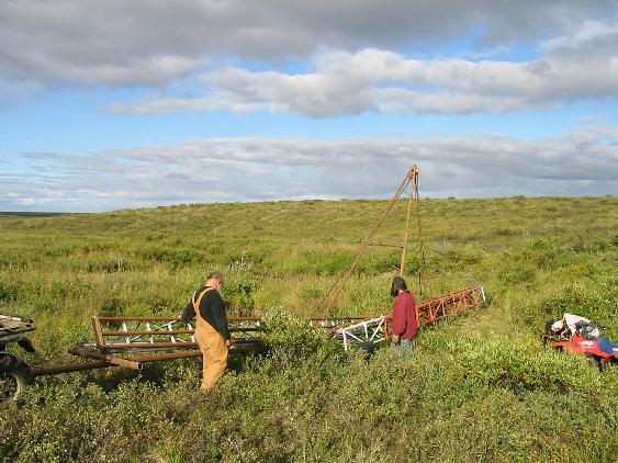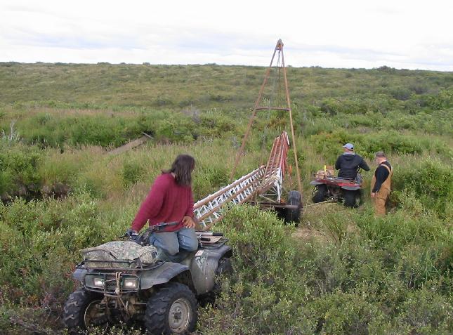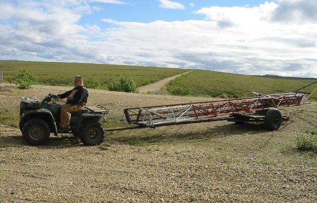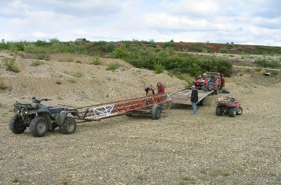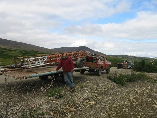 ![]() ©2003 Scott Webber: 169 Finally, at Mile 80 on the Nome-Taylor highway we arrive at a roadside gravel pit. The cabins in the left background is what is known as 'Brakes Bottom.' The origin of this name is not known. To the right, out of sight, is Quartz Creek. In this picture, the small trailer containing the bridge components has been hooked up to the Honda 300 4x4 ATV. This is a humongous load for this little ATV, but going slow it made it. |