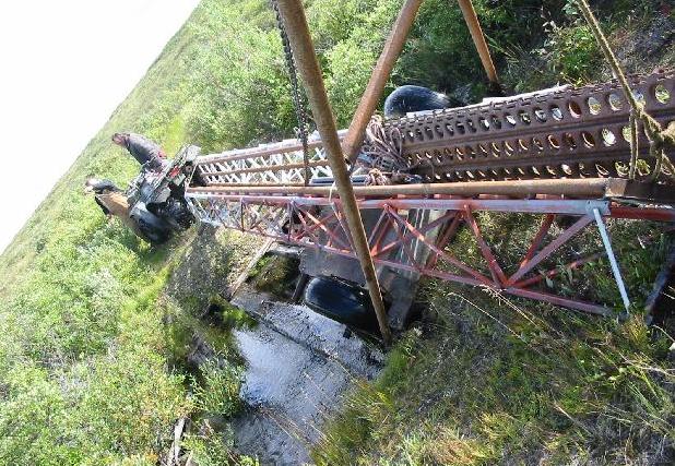 ![]() ©2003 Scott Webber: 174 We have arrived at Coffee Creek. The water on the left is just a puddle. The timber on the left is all that is left of the original bridge, which collapsed into the water. Here we are backing up the trailer/crane/bridge towards Coffee Creek. Ramon is in coveralls; Keith Andrews is on the left fudsing with the bridge, and Carl Rock is the wearer of the blue hat. Not shown is Scott Webber who was taking these pictures. |